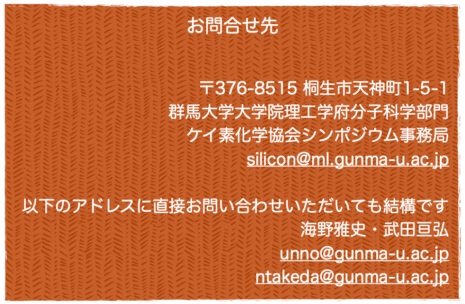 予稿原稿は、こちらのテンプレート(Wordファイル)からご作成いただき、pdfファイルをこちらのサイトからご提出ください。ご質問は事務局(silicon@ml.gunma-u.ac.jp)までお送りください。
